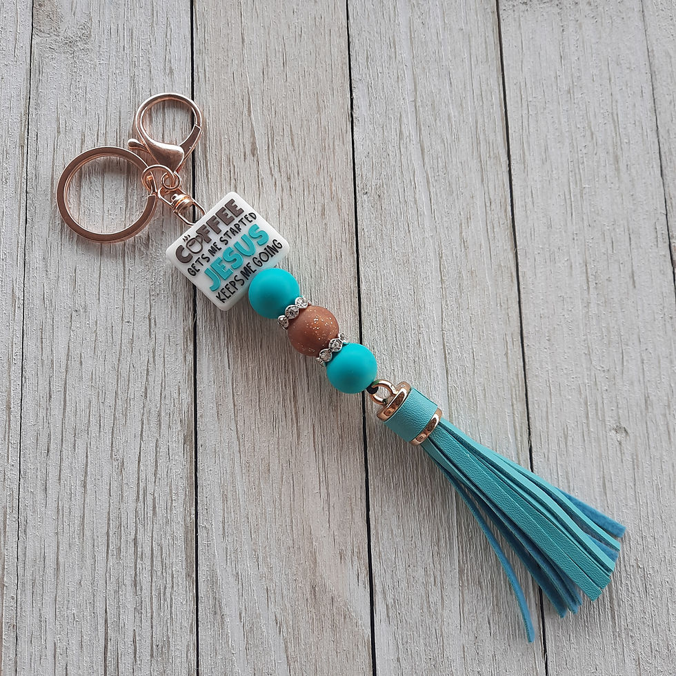 Coffee Gets Me Started Jesus Keeps Me Going Long Beaded Tassel Keychain